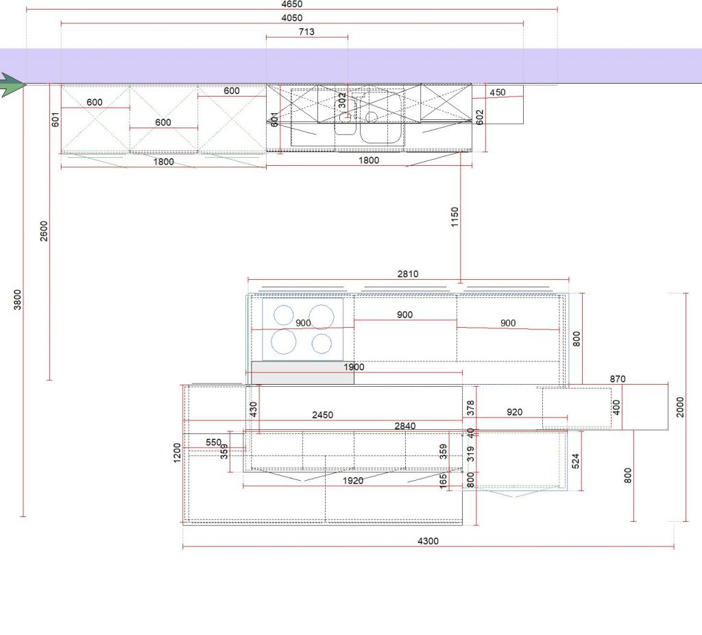 Unterschiedliche Griffkombinationen bei der Insel grifflos und auf der Spülenseite befinden sich an den Schränken aufgesetzte Griffe.