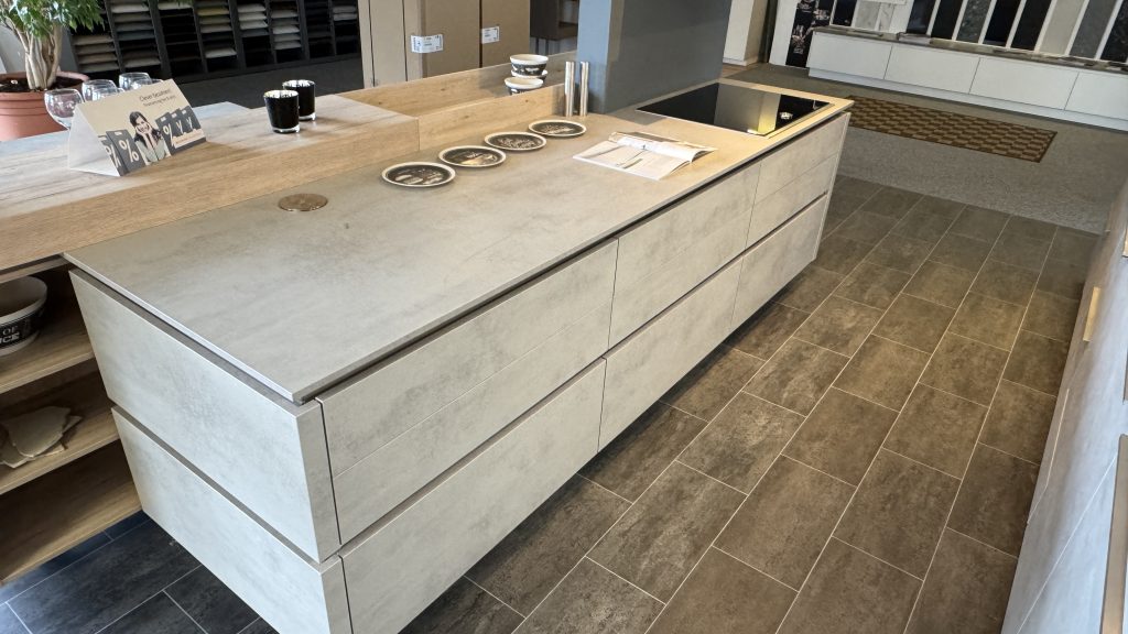 Fronten in heller Beton Optik die Arbeitsplatte in Slimline 16 bis 25 mm